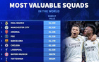 世界俱乐部身价前20:皇马13.4亿欧第1,曼城第2,阿森纳第3